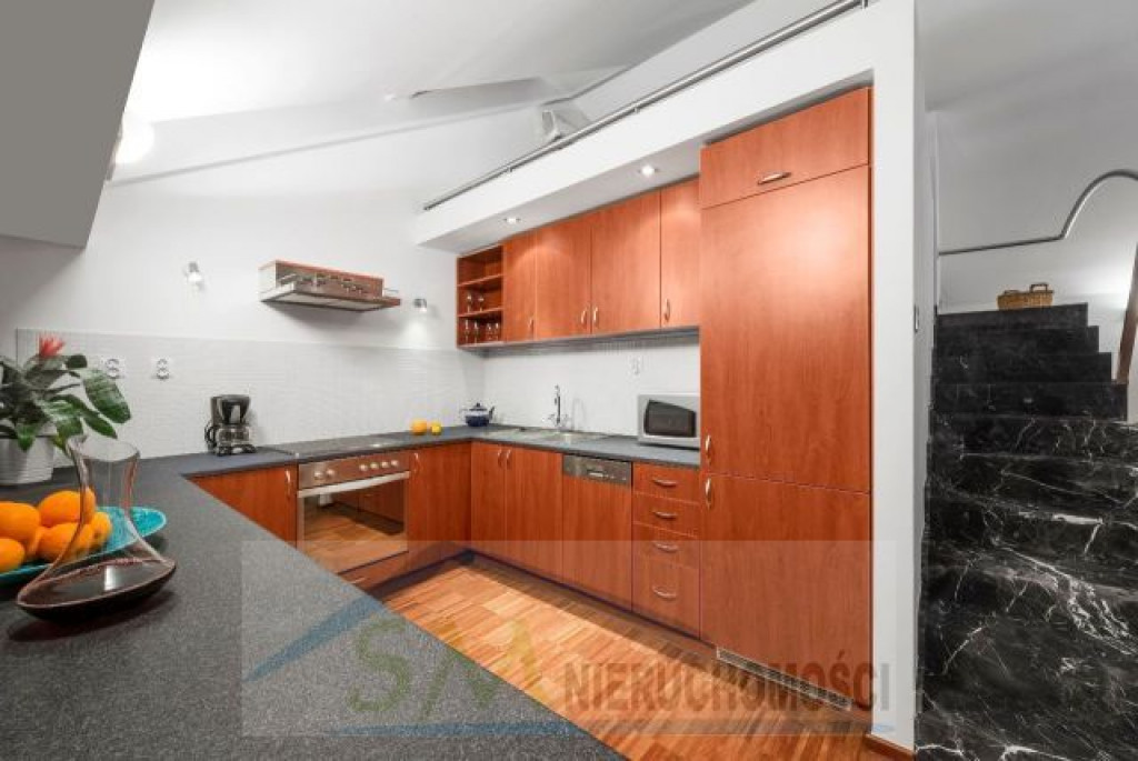 Nowocześnie wyposażona kuchnia. W kuchni lodówka z zamrażarką, ceramiczna płyta kuchenna, okap, elektryczny piekarnik, mikrofalówka, zmywarka, zlewozmywak, szafki również na wino.
