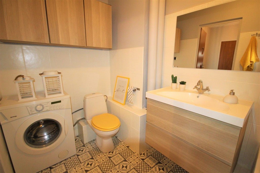 Kuchnia o metrażu ok. 12 m2, widna i wyposażona w meble i sprzęt kuchenny (lodówka, zmywarka, kuchenka gazowa), z miejscem do spożywania posiłków. Łazienka wyremontowana, wyposażona w wannę i pralkę