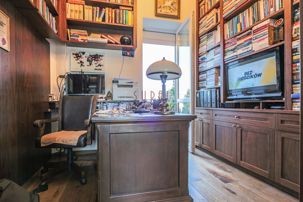 W salonie pojemne półki na książki, biokominek, na podłodze deska dębowa, podłączenie pod projektor. W gabinecie mnóstwo miejsca na książki, w sypialni pojemne szafy. Kuchnia w stylu prowansalskim z pełnym wyposażeniem najwyższej jakości (płyta indukcyjna, piekarnik oraz kuchenka mikrofalowa Miele, zmywarka Siemens). W łazience wygodny duży prysznic, umywalka, toaleta i półki do przechowywania. W przedpokoju szafa na okrycia wierzchnie. W KW 68,9 m2, po podłodze 70 m2.