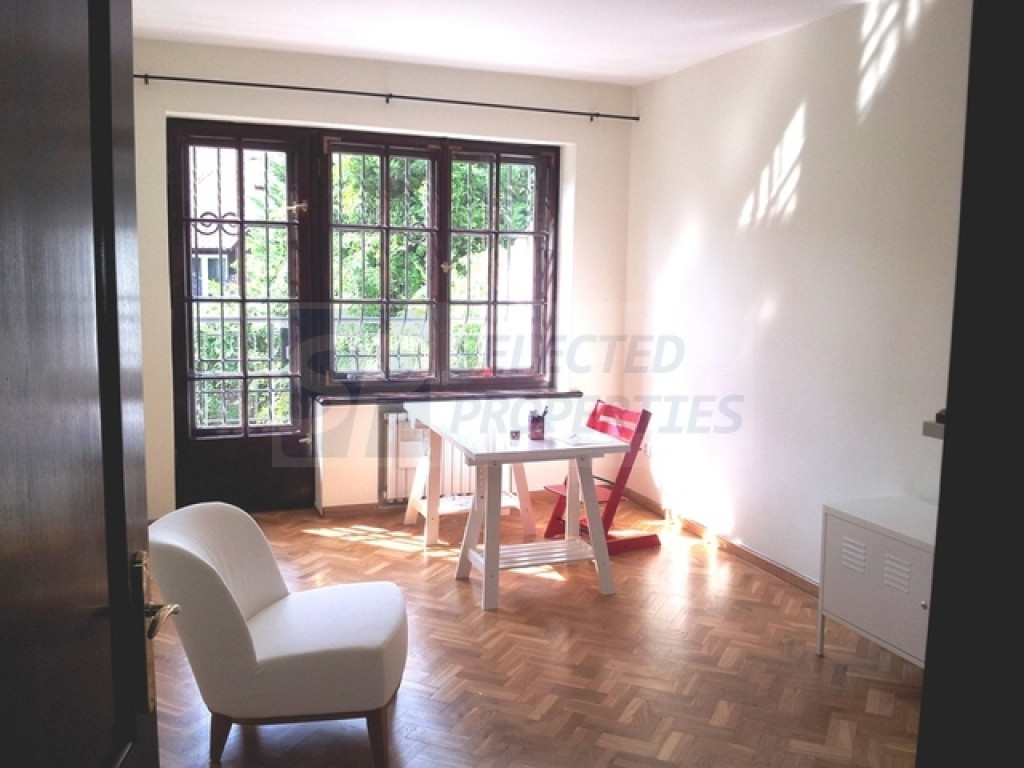 A very spacious, comfortable home for a family with children. The property has an attractive garden with automatic watering. Direct entrance to the garden through the terrace from the living room. Nice garden space around the building due to the side location of the townhouse. Elevated ground floor offers a spacious entrance hall, comfortable dressing room, a large kitchen with breakfast area, study room and a spacious living room with a fireplace, at this level there is a guest toilet. On the first floor there are three bedrooms, the main has separate dressing room and a large bathroom, the other two bedrooms have individual dressing rooms and a shared bathroom. In the attic there are 2 rooms with a slanting ceiling, bathroom and a dressing room. The house has a spacious garage with the transition to the building, boiler room, laundry, storage, and a large play/family room.