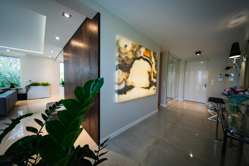 -gustowny hol z pięknym podświetlanym Onyxem na ścianie oraz robionym na zamówienie wielkim lustrem