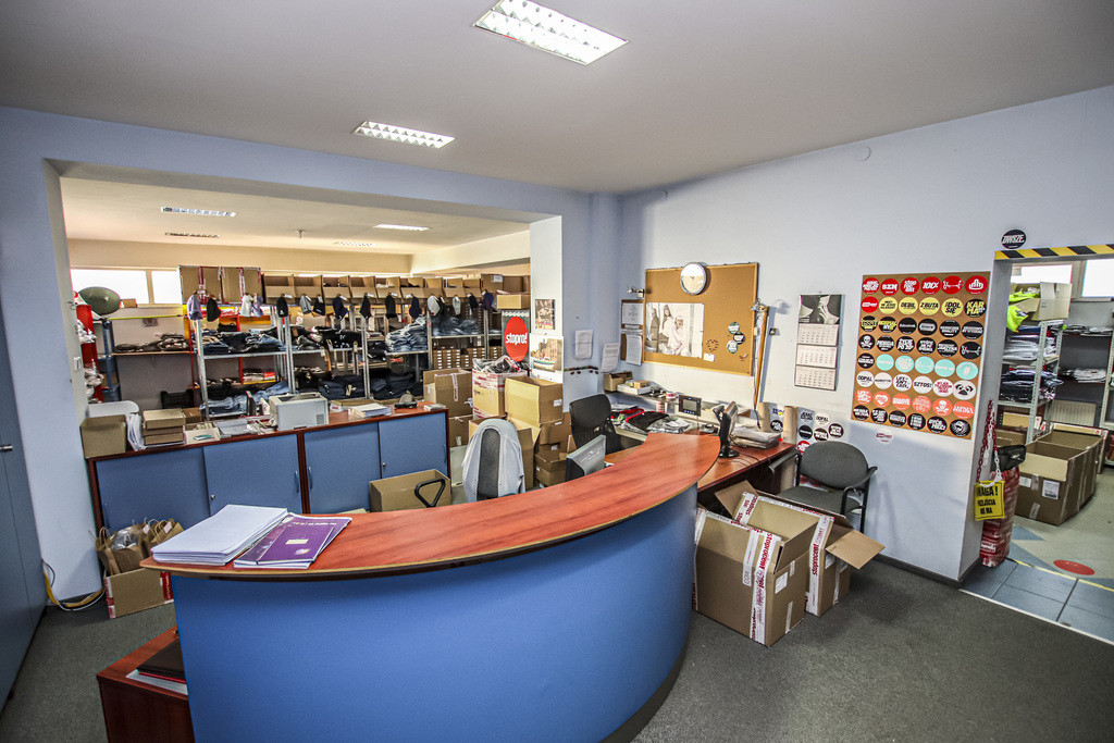 - Podłogi - wykładzina (korytarz, biura, sale) lub terakota (łazienki i część magazynów), betonowe.