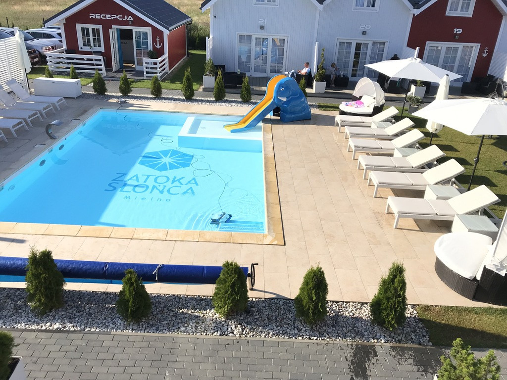 W każdym domku znajduje się kompletnie wyposażona kuchnia ze zmywarką, salon, dwie sypialnie oraz WC z łazienką. Przed domkami znajdują się tarasy wyposażone w stoliki i miejsca do siedzenia. Do użytku są też leżaki i parawany plażowe. W domku maksymalnie może mieszkać 8 osób. Na terenie ośrodka znajduje się basen 50 m2, plac zabaw, zadaszone altanki i kamienne grille. Jest to miejsce gdzie można doskonale wypocząć w komfortowej, nowoczesnej przestrzeni pełnej zieleni i atrakcji.